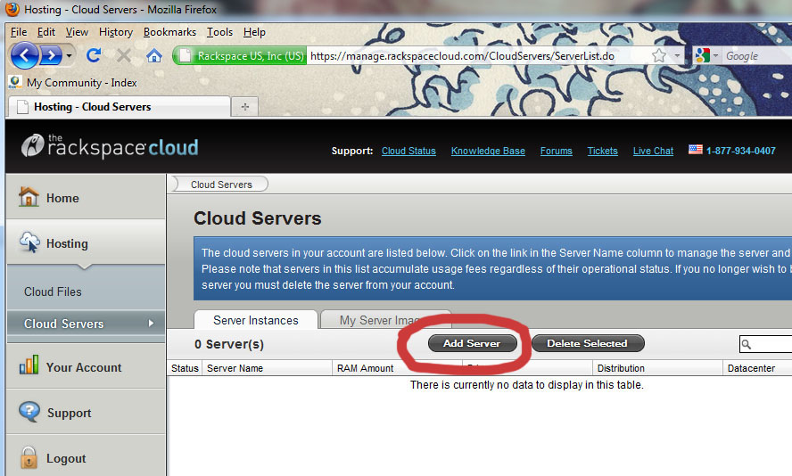 When you are not running your server, be sure to delete the instance and leave the much cheaper image. Unlike Amazon AWS which only charges for usage, Rackspace charges as long as your server exists at all. To start your server again, or to start multiple instances of the same server, use the Cloud Servers menu under My Server Images.