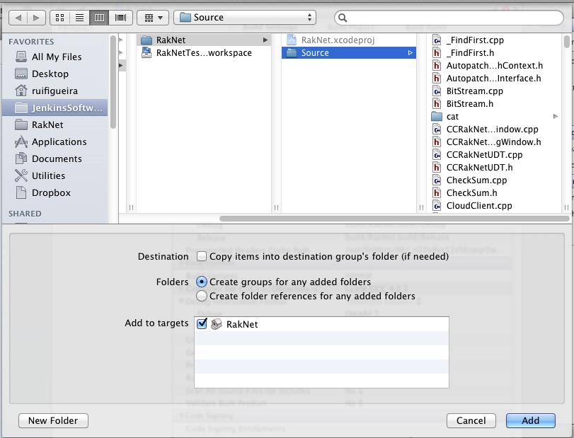 Link Binary With Libraries, clicking the '+' button and picking our RakNet library as shown: