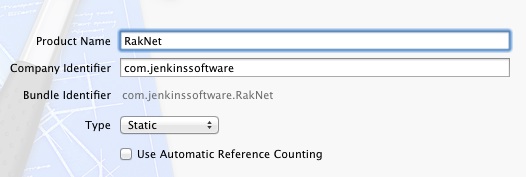 leave Type as C++, and "Use Automatic Reference Counting" unchecked.